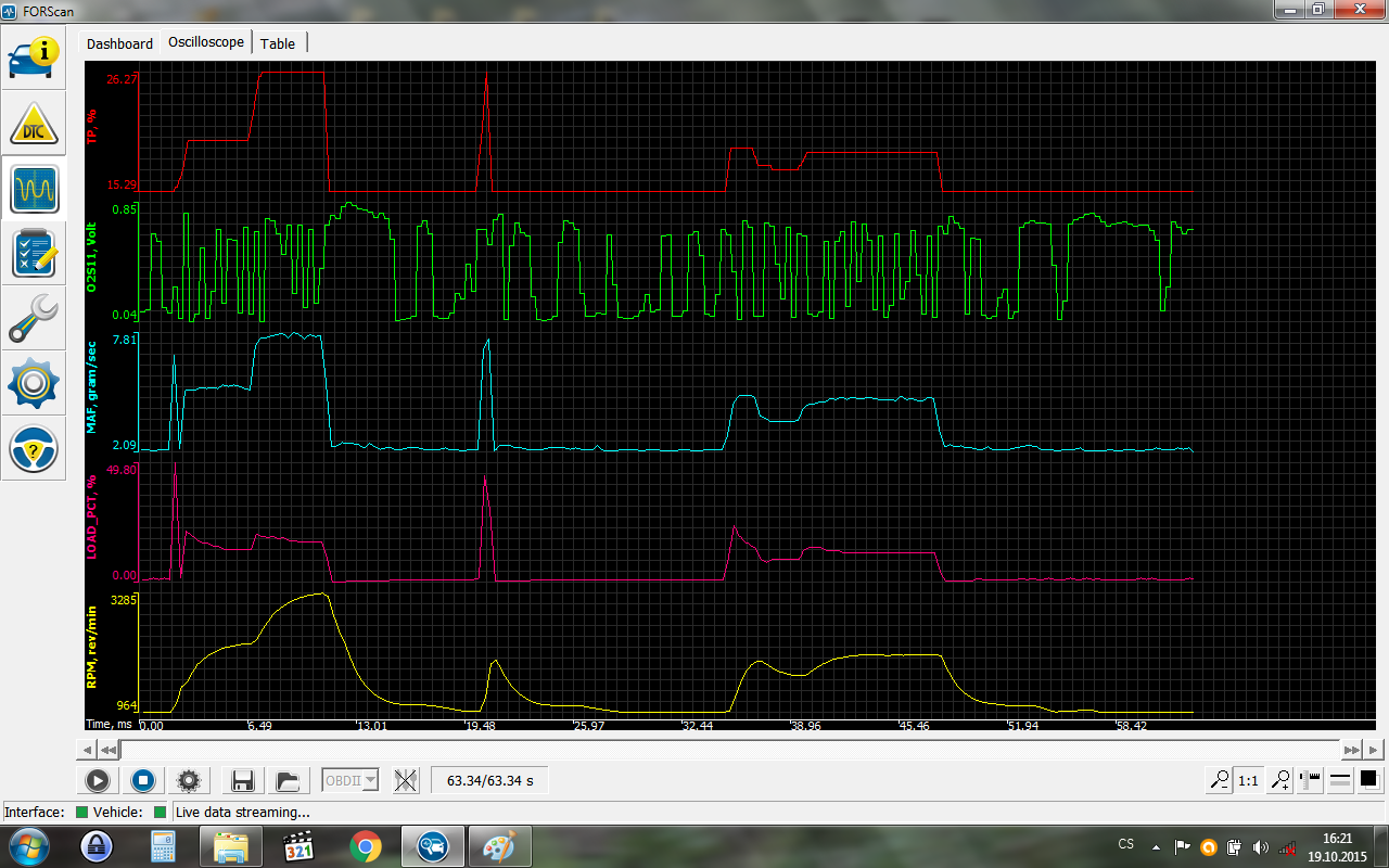 Pocitat kmity lambdy muzes leda tak na osciloskopu. Rozhodne ne na pomale diag. ktera cte par hodnot za sek. Vubec never tomu ze to co vidis ve forscanu je realita prubehu napeti. Na volnobeh jeste ano, ale na 3tis. je to nerealne.bajeluk píše:Nechce se mi teď na tvých grafech počítat, kolik tam kde máš kmitů za daný čas, ale tady jsou rychlosti mé lambdy, kterou jsem novou (univerzál Bosch LS 07) montoval cca před rokem. Tak můžeš porovnat se svou.