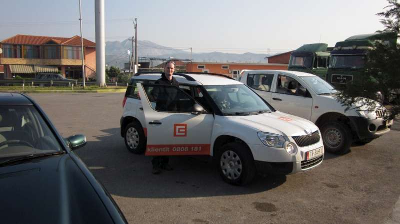 Ráno jsme se pak sbalili, auto zanechali i s rakví na střeše svému osudu na lázeňském parkovišti a vyrazili pěšky směrem k makedonsko/álbánské hranici. U hranice se nás "ujali" místní taxikáři a žačali nás přesvědčovat k využití jejich služeb k cestě do albánského Peshkopi. První nabídka byla 20 Euro za podle nich 50 km cestu (bylo to max 25). Poté, co si spočítali, že je nás pět a bagáž, tak nastal problém s tím, že pět lidí v Albánii vézt nemohou (ve skutečně nemohou v Albábii taxikařit vůbec, takže nemají ani označení, ale za malý úplateček, který jsme mezi doklady zřetelně zahlédli, se to jaksi toleruje) a nabídli dvě auta za čtyřicet euro. To jsme odmítli a chystali se k odchodu. To vyvolalo další diskuzi o ceně a nakonec jsme jeli za 15 Euro/ auto. Běheme cesty jsme se od taxikáře, který uměl anglicky, protože jezdí pracovat do Itálie dozvěděli, že auto má ze Švýcarska, ale doklady k němu nemá, pokud ho staví policie, tak problém není protože uplatí. Na a taky, že nás pěkně natáhl, protože místní vozí na polovinu až třetinu toho, co veze nás.