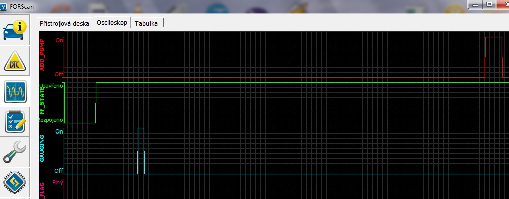 3. řádek: puls měření množství v nádržce aditiva (mám plnou)- nevím, jak se bude chovat při min. hladině.