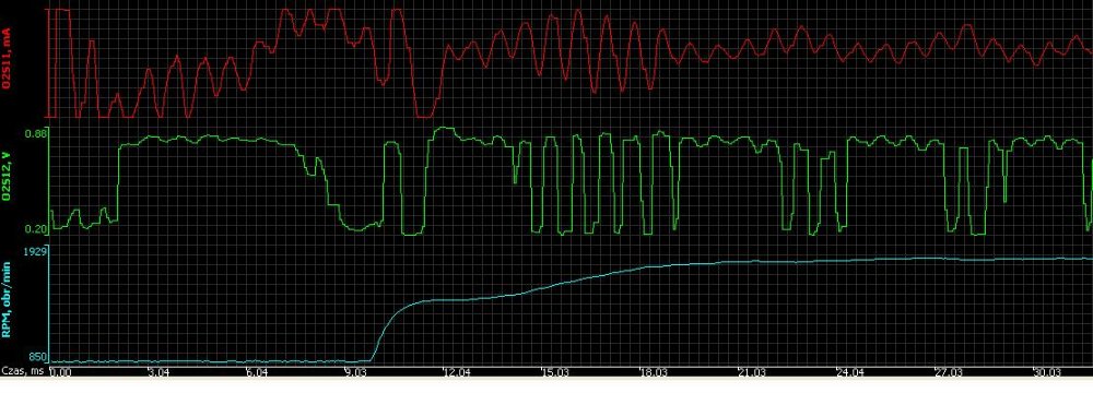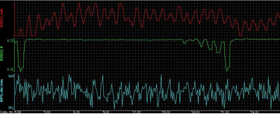 Motor byl zahřátý 10km jízdou, pak 5 minut neběžel, a těsně po nastartování grafy vypadaly takto