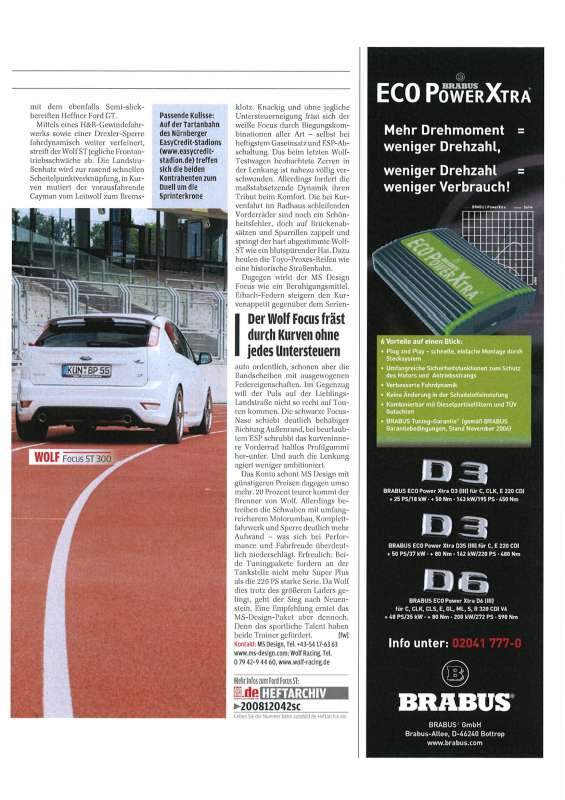 Focus II. ST - r.v. 2006, úprava Wolf Racing (340 PS,545 Nm), Bilstein B16 Gewindefahrwerk PSS9, AP Racing (kotouče 362 mm, 6 pístků) - desky Raybestos směs ST31, samosvorný diferenciál Quaife, výfuk MILLTEK turbo back, Semi Slick TOYO R888