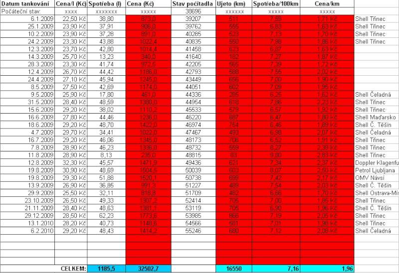 Taky to je asi tím, že jsem tankoval na Shell a měl některé takovaní o 2kč levněji. Ale to je i to poslední za Leden a Únor 2010, jinak je litr Naturalu u nás teď za 31,20kč/l.