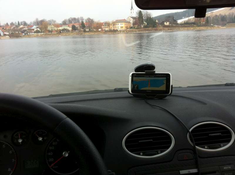včera mi rozesmála moje navigace ve smartphonu - Navigon. Byl jsem v obci Frýdlava na jižní straně Lipna a když jsem zadal cíl "domů" tzn. Praha, ukázalo mi toto. Je fakt, že v létě tam funguje přívoz a v zimě pokud je řádně zamrznuto se tudy vydávají borci i s auty, traktory atp. Párkrát se jim to vymstilo.