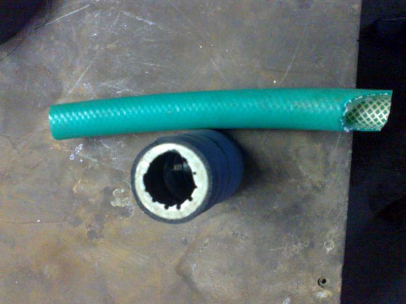 Hadice normální zahradní(jinou jsem nesehnal tak narychlo, uvidíme co to s ní bude dělat. Na jednom konci seřízlá, kvůli lehčímu průchodu plynů a na druhém konci roztáhnutá na průměr pasující do vývodu z odvětrání(trochu s přesahem aby líp těsnila). Nádobka je původem slánka nebo pepřenka ze skla, tudíž jsem ji obalil izolační páskou na trubky na pivní vedení