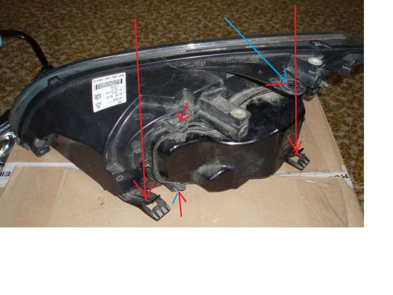 Šroubovák je nezbytný. Nejdřív odšroubuju hlavní uchycení světla(modrá šipka), poté seshora zatlačím na packy a uvolním tím světlo(2 dlouhé červené šipky),které následně vysunu.Poté šroubovákem povycvakám 4 plastové "zarážky" a odstraním dekl.