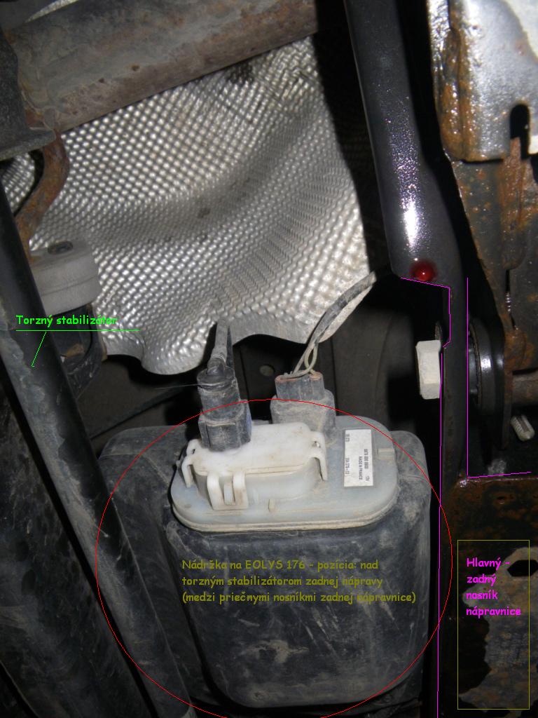 - Štvrtým indikátorom je pri pohľade pod autom na zadnú nápravu tam nájdete nádržku na aditívum do nafty - pre lepšie spaľovanie sadzí/inak je to vraj obyčajný čpavok + niečo/ nazýva sa EOLYS 176. Obr.č.3