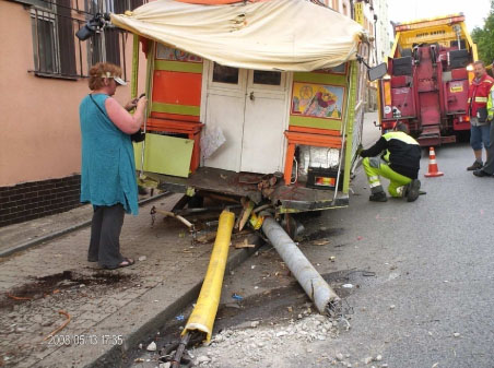 ... již bez koní se rozjetá maringotka záhy zastavila o sloup. Cestou minula lampu, která stojí