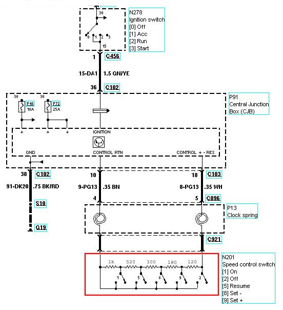 A co se týče mě, tak podle vyjádření technika z Fordu, ve kterém mi to dělali, tak je to vše povoleno a nejede to. Co se týče kabelu, tak ty mám na 100% v pořádku, protože jsem použil ohmmetr, vytáhnul konektor C103 z GEMu napíchl piny 10 a 18 a mačkal jsem tlačítka, a odpory jsou v pořádku podle schématu tempomatu, viz. hodnoty v červeném poli.