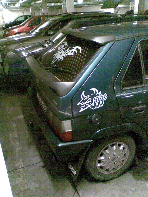 Mimochodem, fotku nemám, ale včera jsem potkal trabíka se zrcadlovýma foliema a na zadním skle byla nálepka NO FEAR