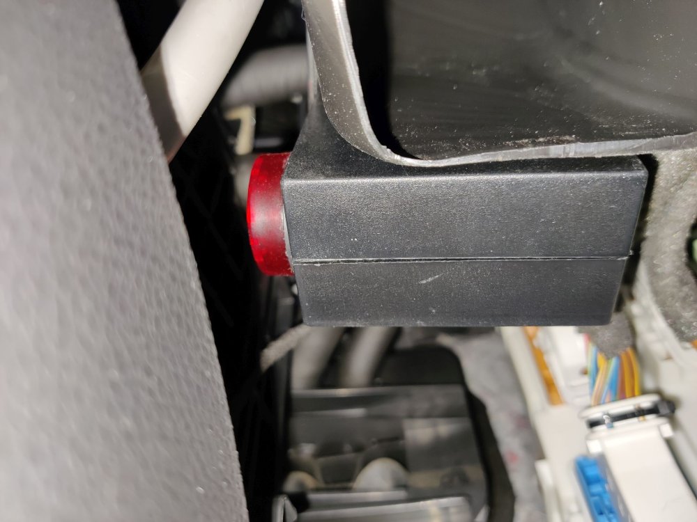 ) jen drcpáskou chycenou na výdech topení u nohou spolujezdce. Udělal jsem si vypínání ze starého mikro vypínače a mám to jen schované za plastem. Aby byla alespoň možnost nějak vypnout. Z boku palubky pod záslepkou, je na mém autě doděláno napájení kamery a nabíječky držáku telefonu, které jsou napájený po klíčku, tak jsem to odtud vzal.