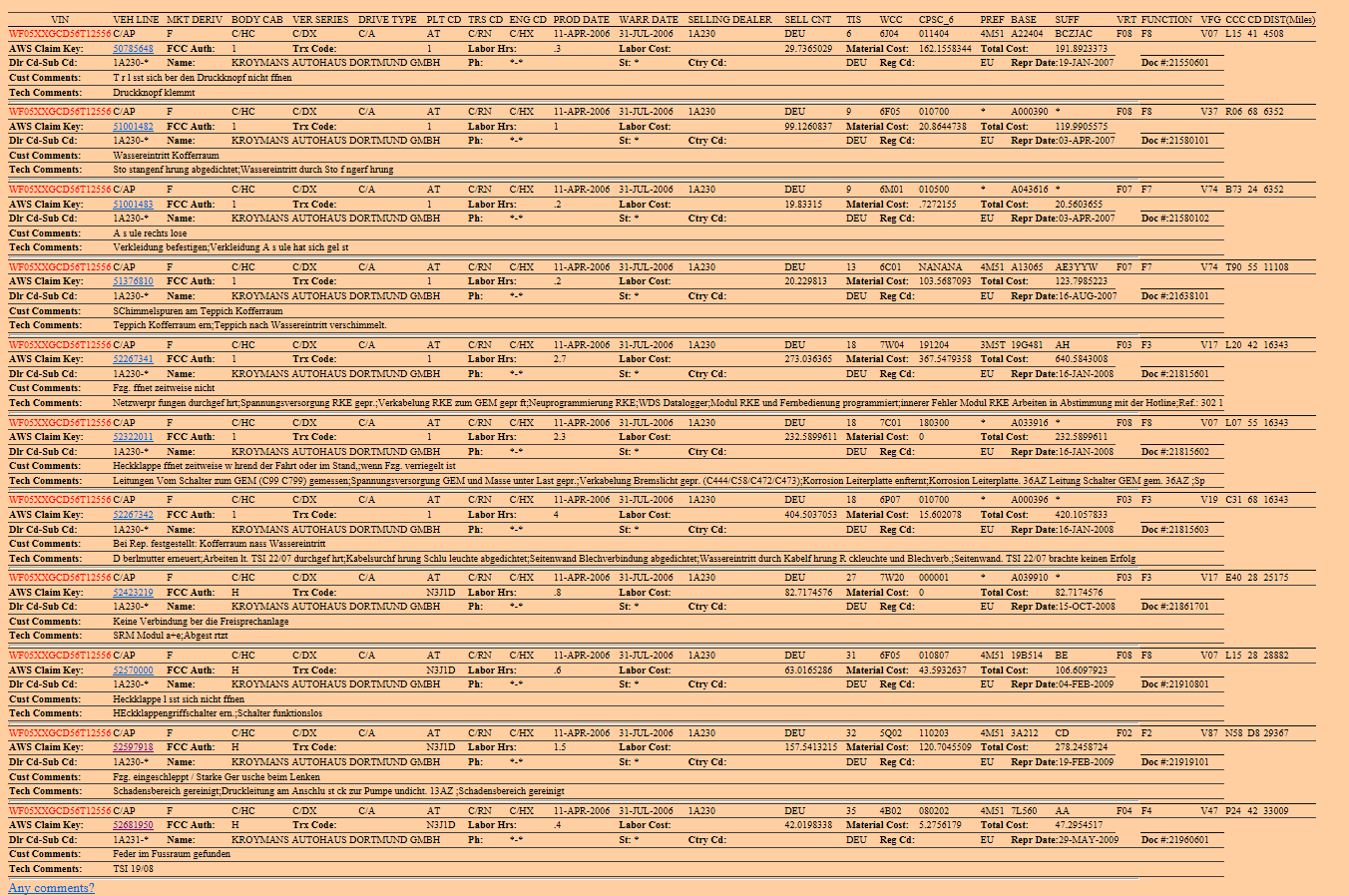 A zisti to i servis co byl provaden v Nemecku,kdyz auto pochazi odtud a ma pry i servisku?Treba u tohoto vinWF05XXGCD56T12556 je pocet zarucnich oprav 8,ma met najeto cca 120000km.Zatim jsem to nezaplatil,tak nevim co bylo opraveno