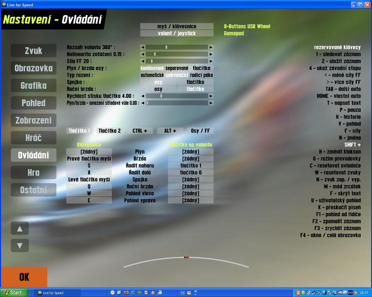 Sakra nic se mi nedaří.V LFS jsem to ovládání jakžtakž nastavil akorát si při jízdě připadám jako bych jel se zataženou ručkou.Když dám nohu z plynu tak okamžitě stojím