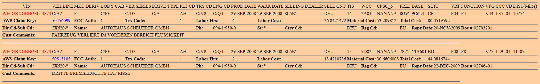 bylo by prosím možné zjistit více o tomto VIN: WF0SXXGCDS8L31206 (případné záruční opravy apod?)
