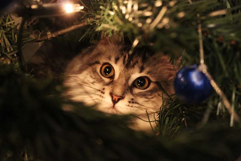 Výraz naší kočky když jsme ji dneska našli, jak se důkladně seznamuje s vánočním stromečkem