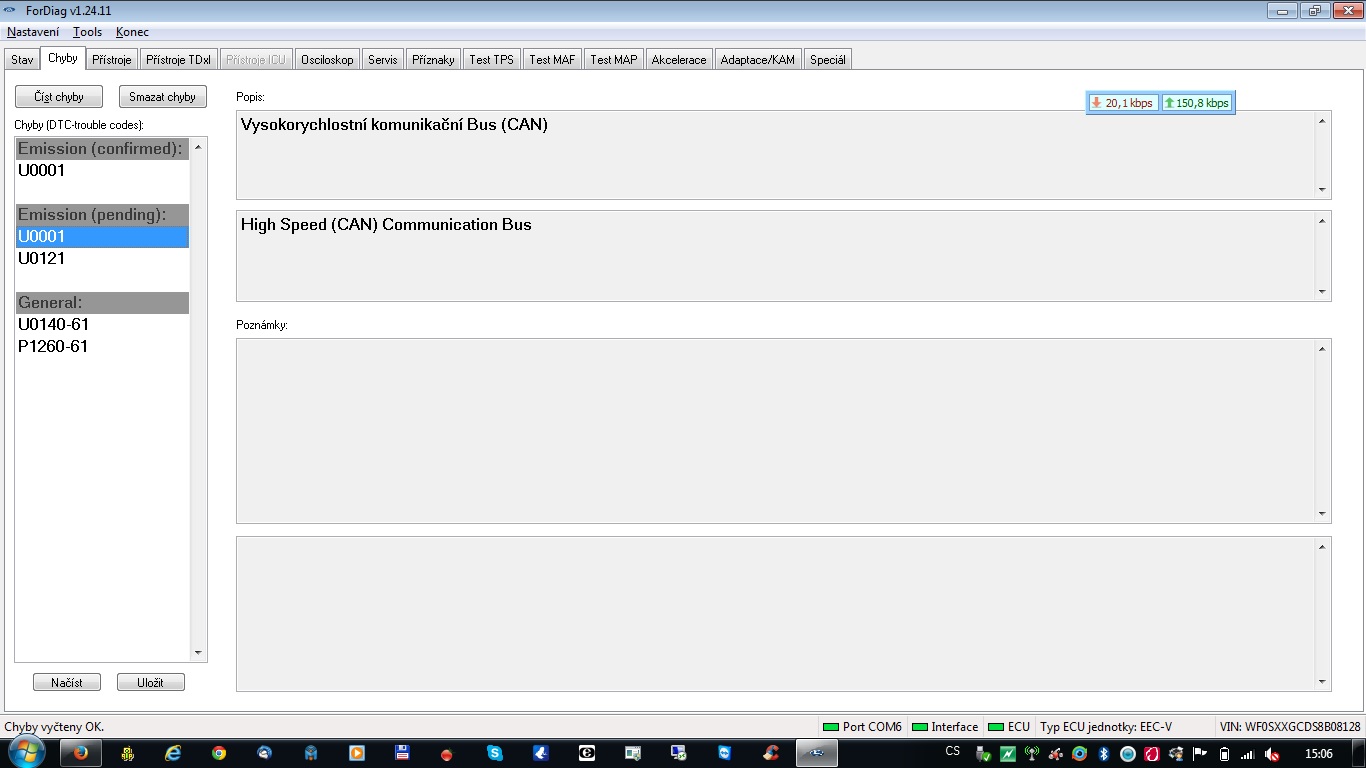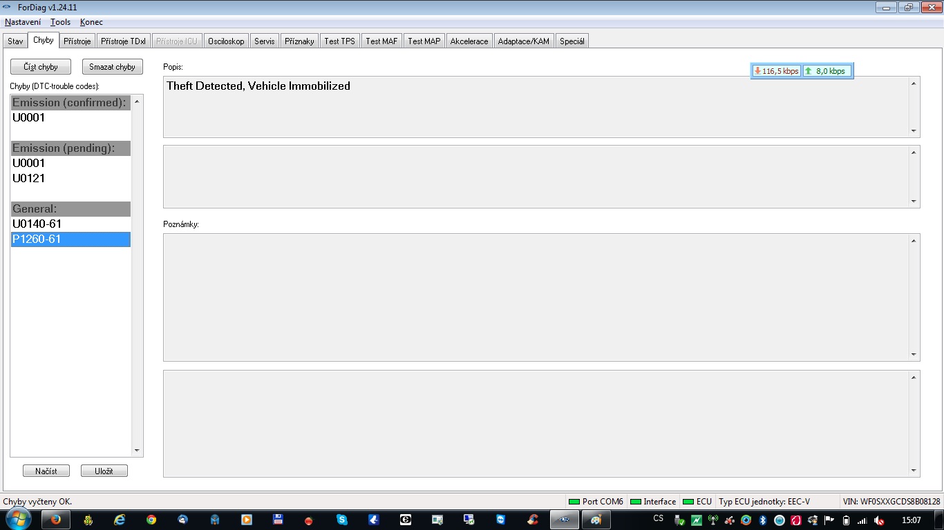 hoj, mám problém na FF 1.6 benzín rv. 2008, na displeji se rozsvítí cca po 1 km chyba Engine Malfunction, rozsvítí se polovina palubní desky, spadnou rafičky na 0 a auto jede v nouzáku, screen z diagnostiky (ForDiag) níže, poradíte kde hledat závadu? díky moc!