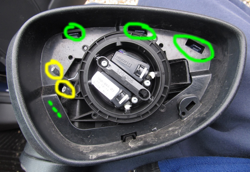 7. odcvakneme 3 zapadky lakovaneho plastu (zelene krouzky) a plast odendame od tela zrcatka ... v miste 3 carecek je jeste jedna zapadka pristupna z druhe strany (opatrne odendame)