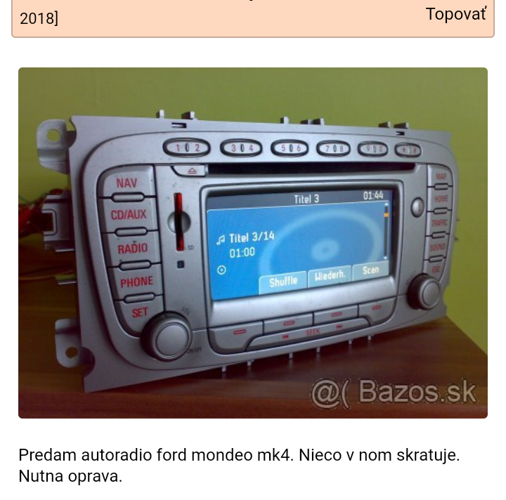 zdar, môžem mať z mondea toto rádio, ale nefunguje, po zapnutí sa vypne, niečo v ňom skratuje, nestrrtol sa s tym niekto? Bude pasovať do FF2 FL, myslím konektory, oplatí sa investovať 60€?