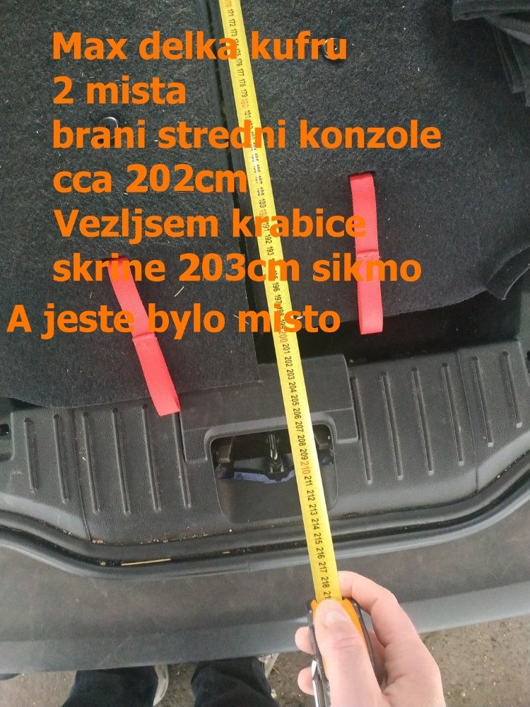 Trošku jsem si hrál při čekání na nábytek a tak snad někomu pomůže. Při velkém nepohodlí a dvou lidech skříně v krabicích nad 2m prevezete (3ks a nejdelší 203cm). Vyskládat kufr do výšky střední konzole pomůže pár cm, ale to jsem nepotřeboval.