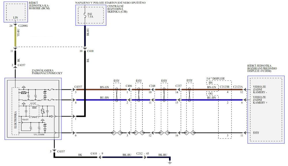 ... v 5. dverich je pak ve schematu popsan konektor C4357, coz je konektor primo na kamere, prestoze je jeste v originalni ceste pruchozi 7 pinovy zeleny konektor