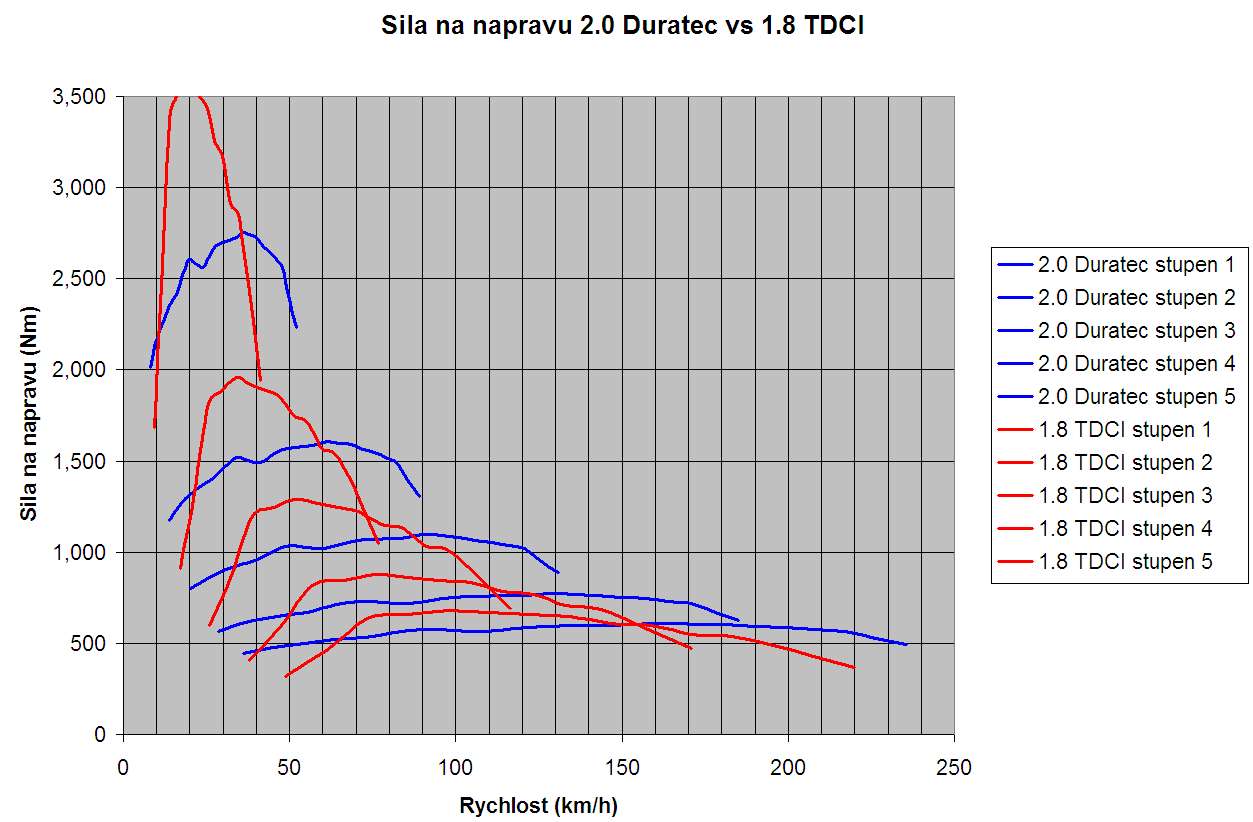 - sila posobiaca na napravu pri jednotlivych prevodoch. Tu by som vysvetlil snad len to, ze benzinove prevodovky su sprevodovane kratsie ako dieselove, teda na jedno otocenie kolesa je potrebne viac otacok benzinoveho motora ako dieseloveho motora, cim vlastne krutiaci moment na napravu sa u benzinoveho motora zvysuje a u nafty znizuje.