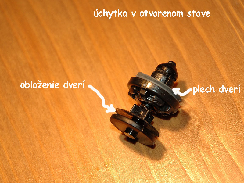 Pomocou napr. vidlicoveho kluca (ja som si este pomohol aj srobovakom, aby to malo tri oporne body-ide to lahsie), treba ho strcit medzi vysuvaciu cast uchytky a pevnu, ktora je na plechu dveri, a tym vlastne uchytku otvorite, "kridielka" sa stiahnu a bude sa dat s plechu dveri vybrat. Nasadite na tapacirung (v otvorenom stave,