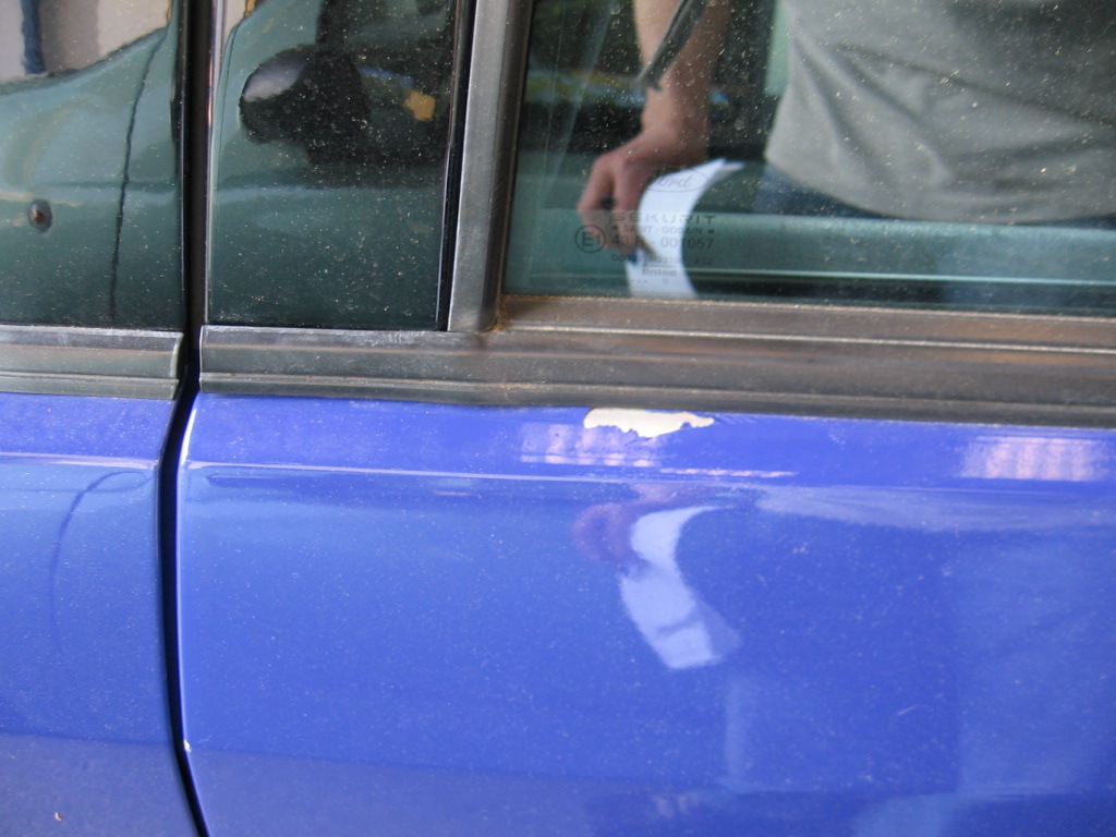 Auto melo v popisu maly prohyb u zadnich dveri. Nemohl jsem pochopit, od ceho to muze byt a prodejce mi to taky nedokazal rict. Za chvili jsem nasel sedrenej lak u okynka zadnich dveri (viz obr.), taky nevedel, asi od klicu... U pantu prednich dveri zevnitr byl lak seskrabanej uplne ... Ale vsechny dvere doviraly stejne dobre a skla mely stejny znaky. Prahy a sloupek vypadaly nedotcene.