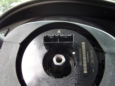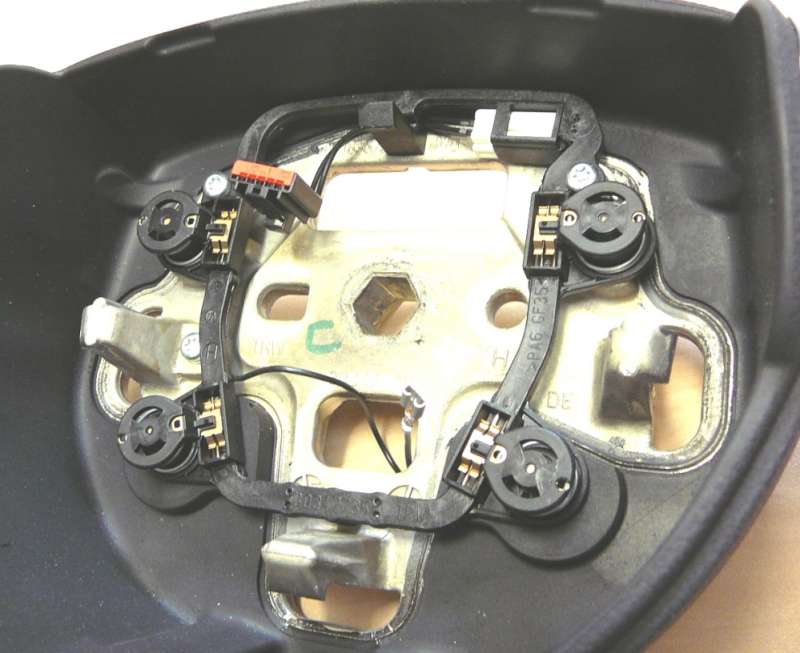 nový volant s konektorem a zřejmě uzemňovacím kabelem. Chybí ještě žlutý káblik vedoucí k airbagu